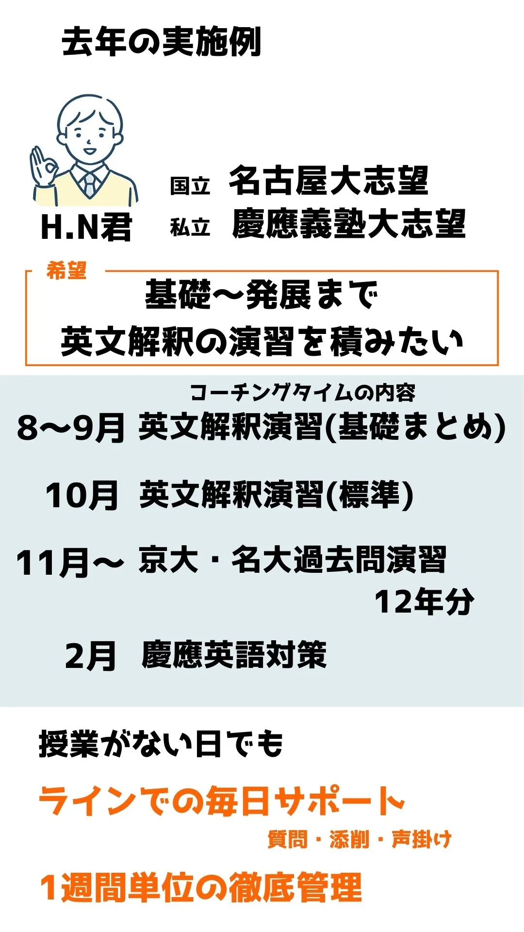 具体的な問題だけでなく、単元の初歩から丁寧に教えてもらえた。予備校だとテキストのことしか質問できないが参考書の内容から何でも聞けて良かった。